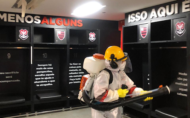 Às vésperas do confronto entre Flamengo e Bangu, que vai reiniciar a disputa do Campeonato Carioca, conforme previsto no protocolo ‘Jogo Seguro’, as cabines de imprensa do Maracanã, palco do duelo válido pela quarta rodada da Taça Rio, passaram por processo de sanitização e desinfecção nesta quarta-feira (17). Foram higienizados os vestiários, corredores, cabines de imprensa e gramado.